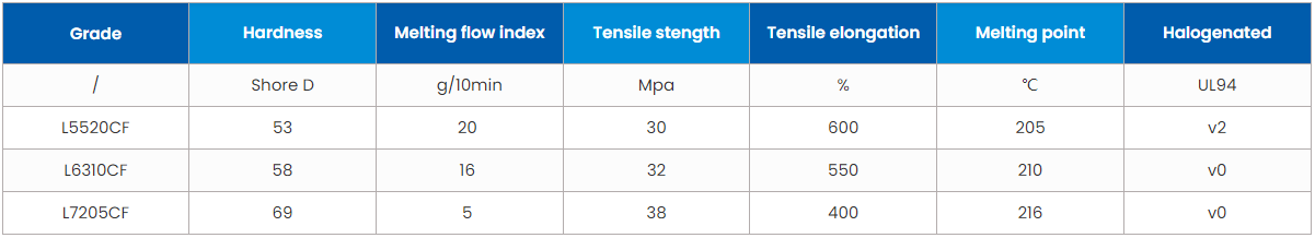 KYLflex? TPC-ET / TPEE has excellent heat resistance, flexibility and creep resistance as well as good dielectric strength. It can be widely used in hose sheaths, wires, cable sheaths, pneumatic hoses, cables for robot arm, data transmission, electronic, locomotive, subways, ships, etc. which has high requirement in safety.