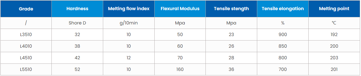 GradeHardnessMelting flow indexFlexural ModulusTensile stengthTensile elongationMelting point