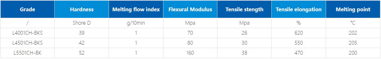GradeHardnessMelting flow indexFlexural ModulusTensile stengthTensile elongationMelting point